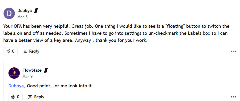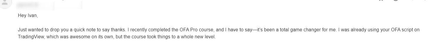 to the TradingView community, where it remains available.That was it — the ultimate test. A community of millions ready to have a go.Would I get positive feedback? Or would criticism follow?Well, since the launch, my OFA script page has received +150,000 visits…With THOUSAND+ likes…and HUNDREDS of traders choosing to deepen their understanding through the course.The best part? Traders have already left HUNDREDS of reviews directly on TradingView.And while a small percentage have adapted the OFA workflow in their own unique ways, like Mike…Do you know what has been the common denominator?The vast majority of traders who used the OFA script would write to me asking how I personally integrate it into my charts and routine.Recognising the consistently strong interest and enthusiasm on TradingView, it felt like the right moment to consolidate everything into a complete learning resource…How? By packing tens of thousands of hours of experience with the OFA script into an easy-to-digest course. The goal was simply to shorten the learning curve for those who wanted a structured way to study it.At last, traders with access to the course could learn what it means when the script prints the DIAMOND or CIRCLE visual patterns…I knew that, without guidance, it could take most people years to fully understand the nuances behind the script’s visual structure.I just wanted to have the validation of the TradingView community before I launched something more complete.That’s how this OFA script course came to be.An organic movement — shaped by curiosity, demand, and the TradingView community itself.To this day, I am very proud of how things have grown since the launch.And rather than me describing the benefits again…I simply invite you to explore it for yourself.