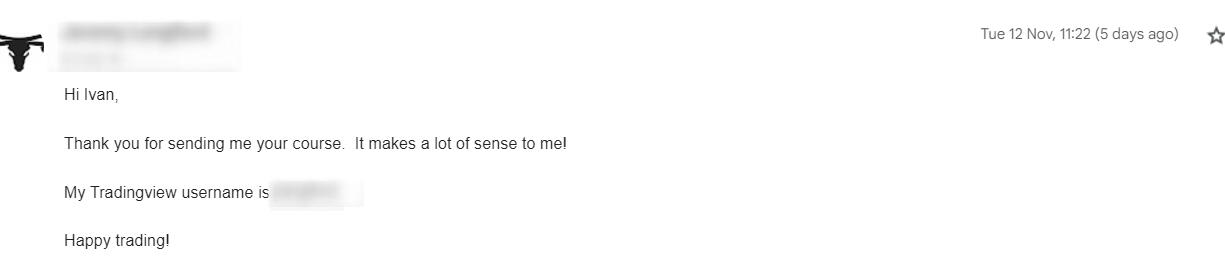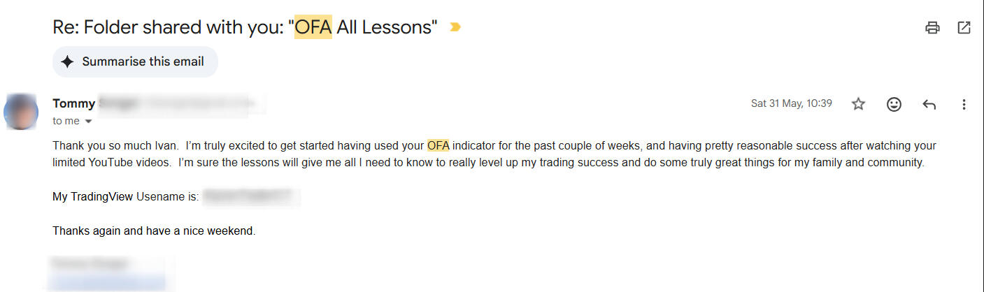 Terry from Australia, after an early retirement, had always been curious about financial markets.After much rumination, Terry decided to try out trading.But what followed were years of ups and downs, and his initial goal of building consistency felt further and further away.He eventually realised he needed a clearer framework to help organise his decision-making.Fortunately, one day he came across some of my work at the past brokerage I worked for, including the OFA script. The challenge, however, was the learning curve that comes with understanding its unique visual structure on his own.He reached out for guidance. Let's just say, he was very pleased with the experience.
