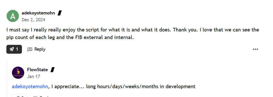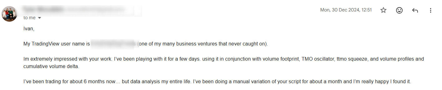 Reviews can be found in TradingView's OFA landing page (I added a few in the website) as well as email messages sent to me.
